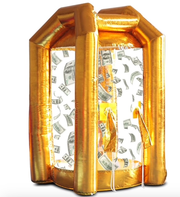 Party-on Rentals is excited to provide our customers with this exciting and fun inflatable cash cube, This Cash Cube blows coupons, paper money, or cash around players who try to catch as much as possible in a certain amount of time. They are perfect to rent for trade shows, fundraising events, corporate parties, car dealerships, school functions, and many other events. You can put your own items in the cash cube to play for. We take care of the delivery, set up, and pick up. Our expert team can answer any questions you may have about the game on site.